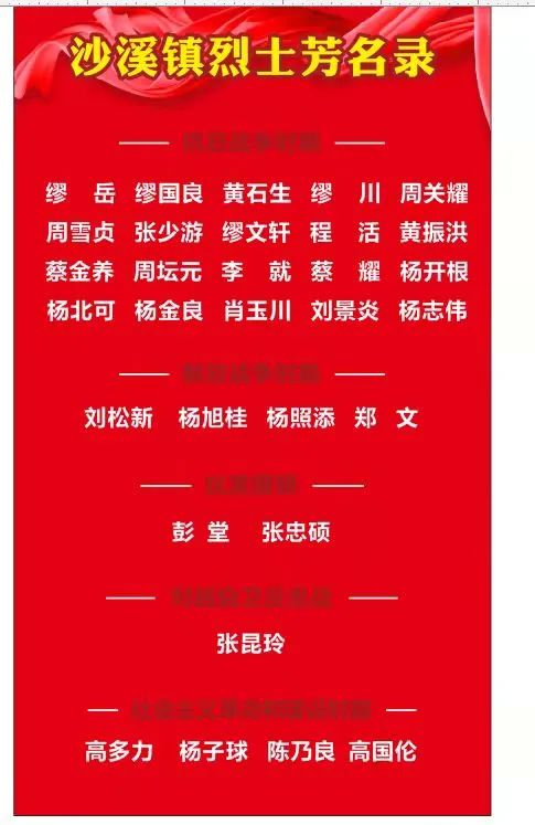 在《中山市民政志》記錄在冊的沙溪鎮(zhèn)烈士共31名。其中抗日戰(zhàn)爭時期20名,解放戰(zhàn)爭時期4名,抗美援朝2名,對越自衛(wèi)反擊戰(zhàn)1名,社會主義革命和社會主義建設(shè)時期4名。
