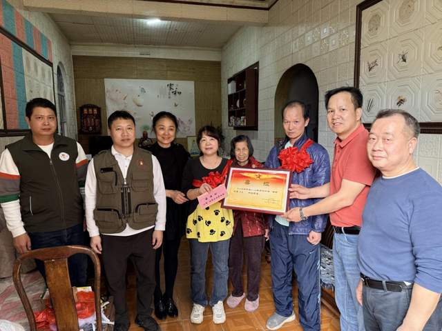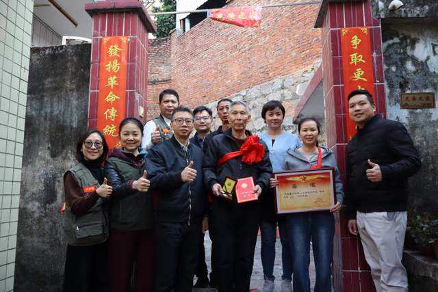 ▲慰問組為濠涌村方漢明家屬送上“四有”優(yōu)秀士兵喜報(bào)
