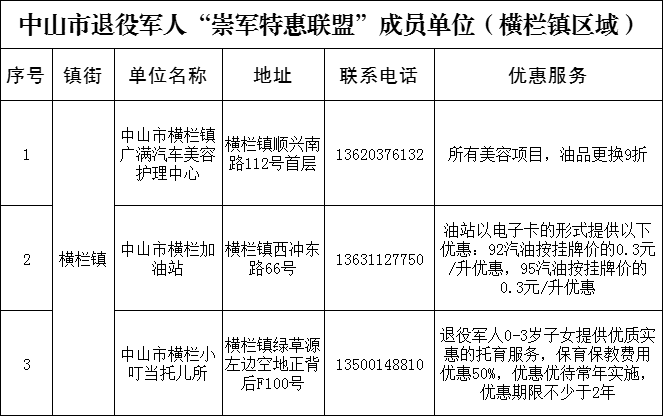 為貫徹落實習近平總書記關于退役軍人工作重要論述精神,加強退役軍人保障工作,我市決定組建中山市“崇軍特惠聯(lián)盟”。橫欄鎮(zhèn)迅速行動,以“讓退役軍人得實惠,讓軍人職業(yè)受尊崇”為宗旨,秉持“自愿參與、志愿服務、優(yōu)質規(guī)范、合作共贏”原則,分批次招募聯(lián)盟成員單位,為廣大退役軍人提供價格優(yōu)惠產品、優(yōu)先優(yōu)待服務。12月2日,橫欄鎮(zhèn)首批3家“中山市退役軍人崇軍特惠聯(lián)盟”商家正式掛牌。