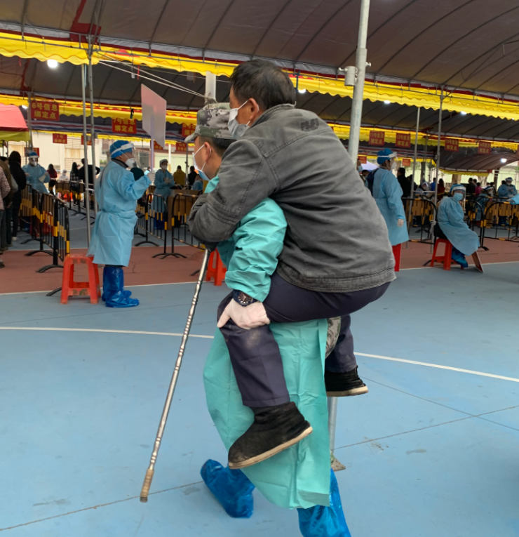 在小欖鎮(zhèn)聯(lián)豐社區(qū)核酸檢測采樣現(xiàn)場,退役軍人吳鴻文背起一位行動(dòng)不便的老人前往核酸采樣工作臺(tái),采樣結(jié)束后,將老人送出場外。臨走的時(shí)候老人連聲向他道謝。 此外,民眾街道退役軍人服務(wù)中心動(dòng)員紅旗志愿服務(wù)隊(duì)退役軍人志愿者分別前往該街道18個(gè)免費(fèi)便民核酸采樣點(diǎn),助力街道開展核酸檢測工作。 |